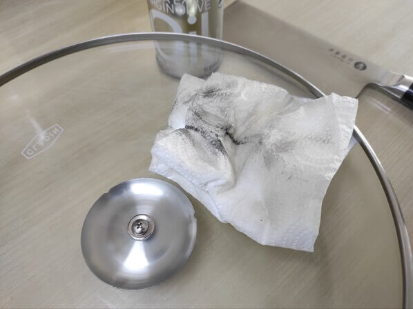후라이팬 연마제 끝도 없이 나옵니다. 특히 뚜껑의 금속 테두리에서는 진하게 많이 묻어 나왔습니다. (오른쪽 사진)